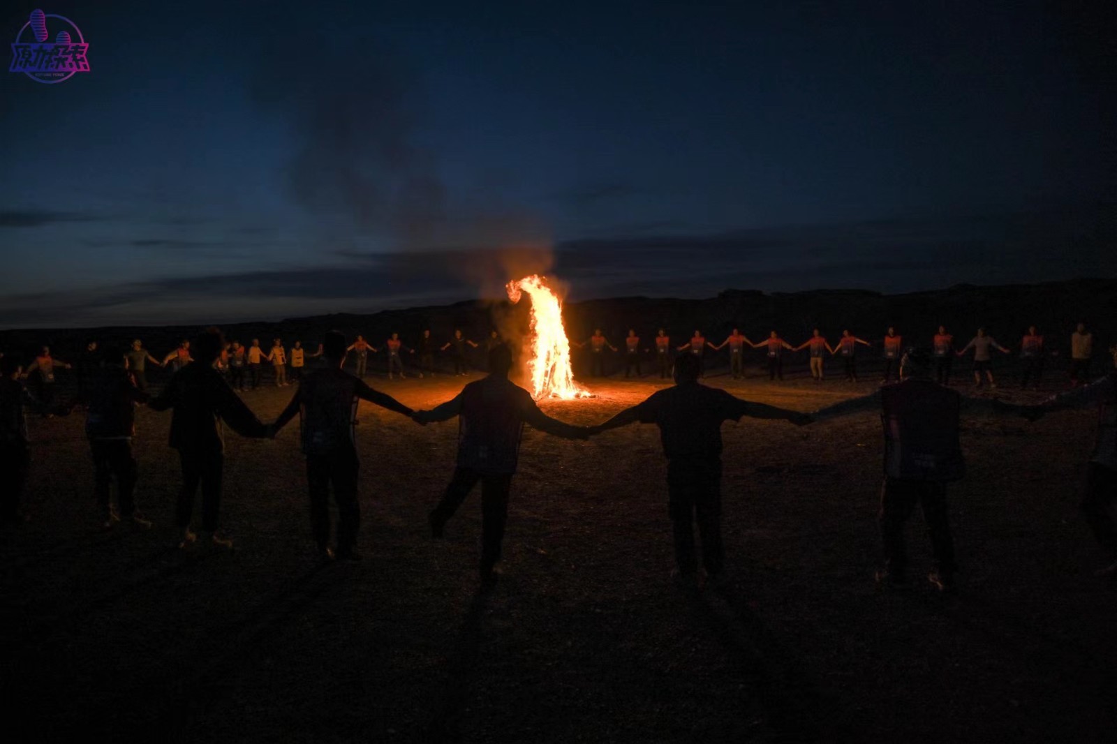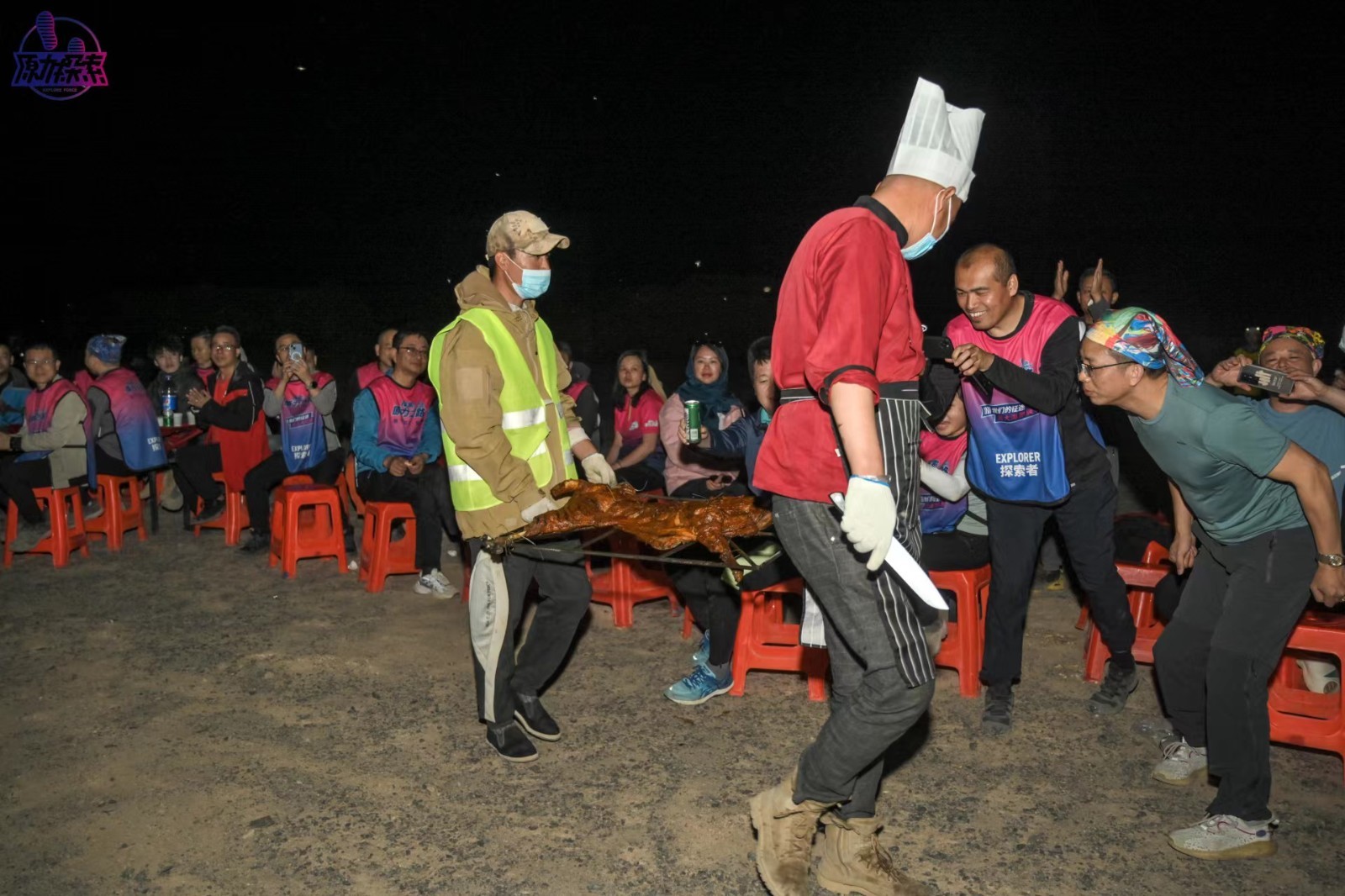 当晚所有人汇聚星空下,由三位战队发起人一起点亮篝火,戈友们起舞歌唱,围桌而坐,欢乐的笑声回荡在茫茫戈壁上。组委会更是为远到而来的戈友献上烤全羊大宴,在经典老歌《朋友》的歌声中,在星空下的烟火中,结束了第一天。